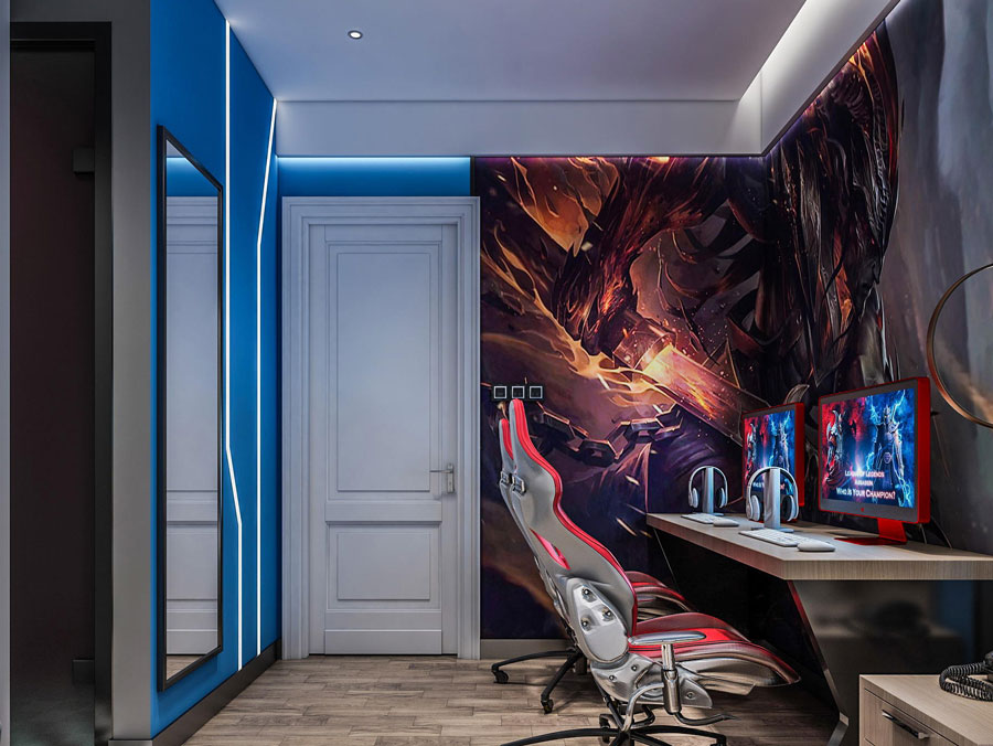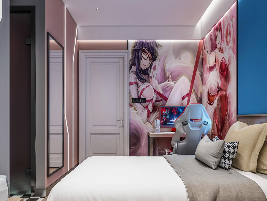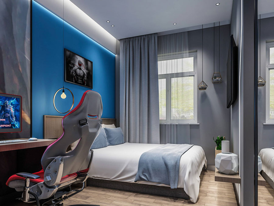 电竞酒店客房装修设计:客房的设计是为了满足大众消费者,设计师希望打造一个性价比高、相对舒适的客房,以此满足客户的需求。客房的设计不是千篇一律,而是各有特色,这样的目的就是为了更大范围的贴合客户的需求,娱乐、舒适与一体,是设计师设计的重点。