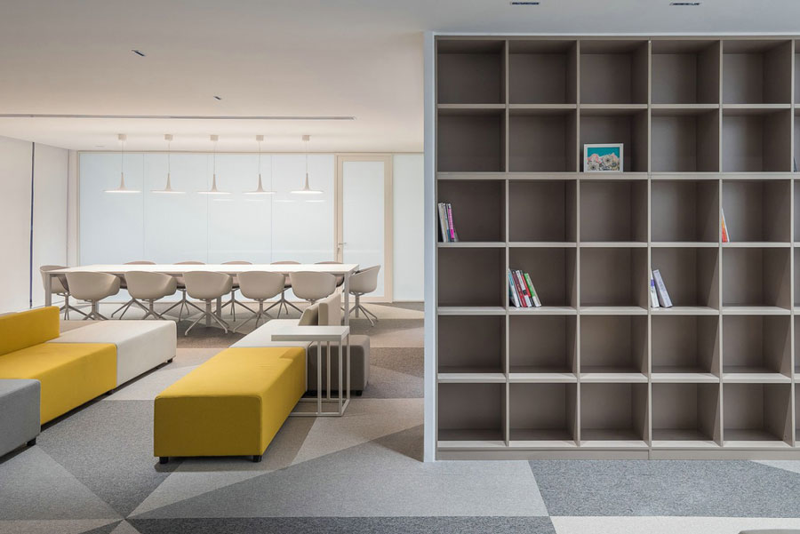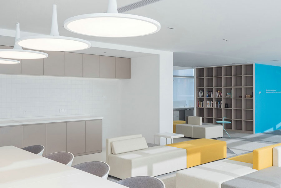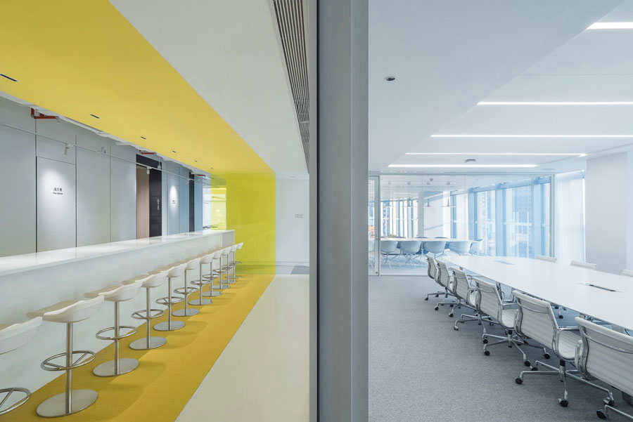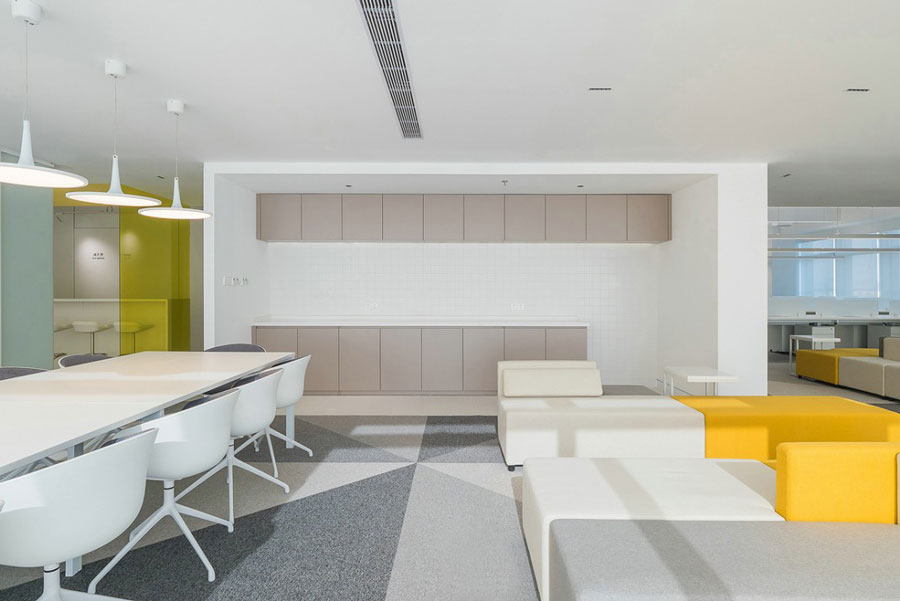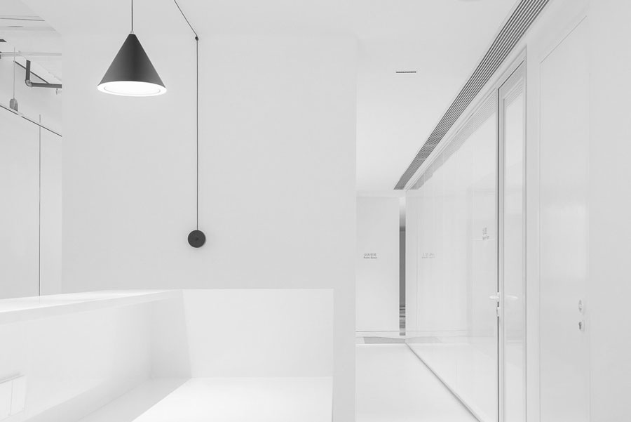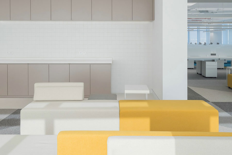 多点聚集的公共空间,有自助下午茶、阅读、健身和派对空间,是大家放松和缓冲的快乐一刻。近200人的办公环境,一定需要缓冲地带,通常叫公共配套空间。我们通过游戏、阅读、派对、健身等这些具有生活感的功能结合,在整体清爽和富有自然光感的空间中,营造一些具有社区化氛围和放松的办公场景。