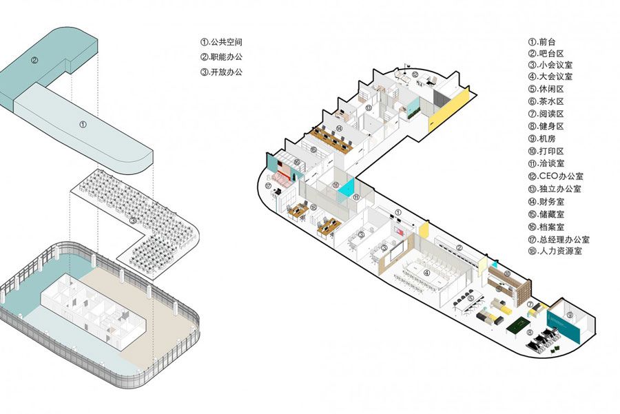 为了构建良好而活跃的动线,同步解决大量的工位需求。我们把公共部分集中在南侧,朝向美丽的花园,让大家休息的时候可以放松眼睛;把职能关系设置在西北侧,这里有着最具吸引力的远眺景观。紧邻北侧的开放办公,则是利用了程序员需要关闭窗帘防止眩光的因素,因此把朝向不佳和紧邻马路的因素结合了这一类功能。